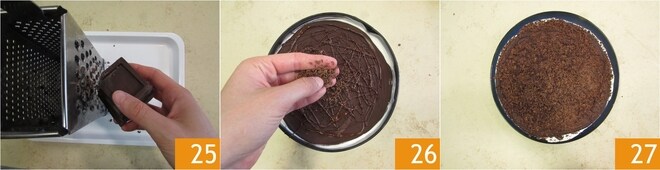 Rale os 100 g de chocolate restantes 25. Se sobrar algum chocolate, despeje-o com um garfo sobre a sobremesa, se tiver solidificado, você pode derretê-lo novamente. Adicione o chocolate ralado 26, desenforme a sobremesa, transfira para um prato e sirva a torta semifreddo 27.
