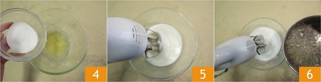 Quando atingir 115°C, você poderá começar a bater as claras. Coloque-as em uma tigela, adicione o açúcar restante 4 e bata com a batedeira elétrica 5 até que fiquem bem firmes. No momento em que o xarope atingir 121°C, despeje-o lentamente nas claras, sempre com a batedeira em ação 6.