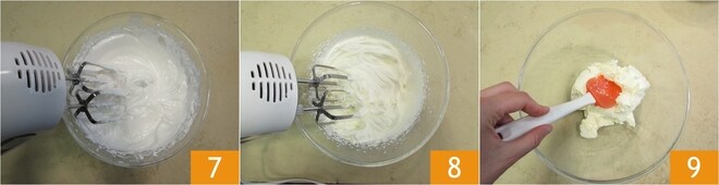 Continue batendo com a batedeira até que a mistura esfrie. Agora limpe as pás e bata o creme de leite, que não deve estar em ponto de neve, mas apenas semibatido 8. Amacie em uma tigela grande o mascarpone, trabalhando-o com uma espátula 9.