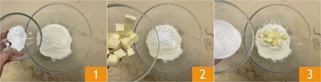 Para preparar o bolo Susanna, comece pela massa. Em uma tigela, coloque a farinha, o fermento 1, a manteiga em cubos 2 e o açúcar 3.