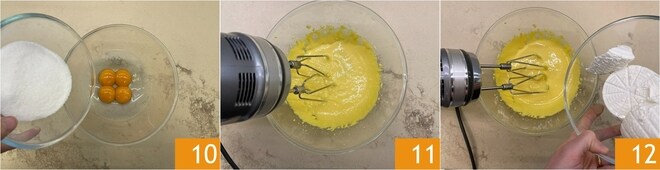 Enquanto isso, prepare o creme. Em uma tigela, coloque as gemas e o açúcar 10 e bata com uma batedeira elétrica 11. Quando estiverem claras e espumosas, adicione a ricota bem escorrida 12.