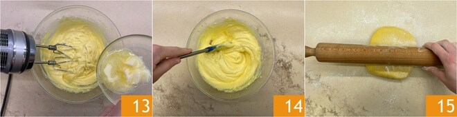 Bata novamente com o batedor para incorporar a ricota. Aqueça a manteiga por 30 segundos no micro-ondas e adicione à mistura 13. Misture novamente até incorporar ao creme 14, depois coloque na geladeira. Retire a massa e abra com um rolo em uma superfície levemente enfarinhada 15.