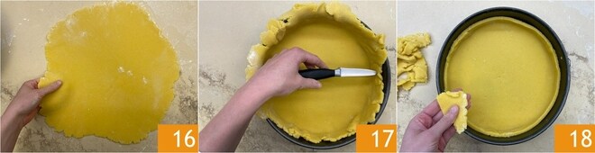 Você deve obter uma espessura uniforme de cerca de 4 mm 16. Transfira a massa para uma forma de 24 cm e faça-a aderir bem. Em seguida, corte o excesso de massa, deixando uma borda de 2-2,5 cm 17 18. Coloque na geladeira por 30 minutos. Este passo ajudará a manter a forma durante o cozimento.