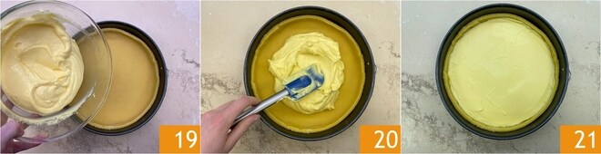 Neste ponto, transfira o creme para dentro 19 e nivele com uma espátula 20 21. Asse em forno estático pré-aquecido a 175°C por 40 minutos.