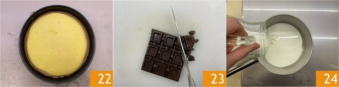 Passados os 40 minutos, retire o bolo do forno 22 e deixe esfriar. Enquanto isso, prepare a cobertura: pique finamente o chocolate amargo 23. Despeje o creme de leite em uma panela 24.