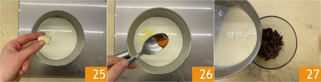 Adicione a manteiga 25, o mel 26 e aqueça. Assim que começar a ferver, desligue o fogo e despeje sobre o chocolate 27.