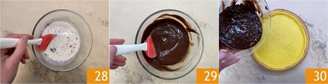 Misture com uma espátula 28 até obter um composto brilhante e homogêneo 29. Deixe esfriar, mexendo de vez em quando, e despeje no centro do bolo 30.