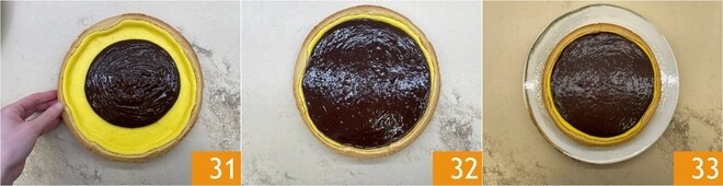 Inclinando ligeiramente o bolo 31, você garantirá que a ganache cubra-o completamente 32. Coloque na geladeira por algumas horas antes de servir 33.