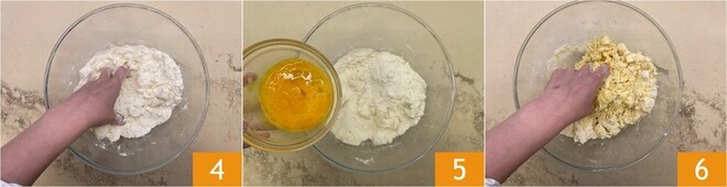Amasse com as mãos até obter uma mistura esfarelada, em seguida adicione os ovos 5 e continue a amassar com as mãos 6.
