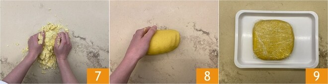 Quando a massa começar a tomar forma, transfira-a para uma superfície e trabalhe rapidamente com as mãos 7 até obter uma massa homogênea 8. Envolva-a em filme plástico 9 e deixe descansar na geladeira por cerca de 30 minutos.