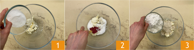 Para preparar a torta vegana, comece pela massa da pasta frolla vegana: em uma tigela junte a manteiga vegana com o açúcar 1 e trabalhe com uma espátula de silicone (marisa) para incorporá-los 2. Quando obter uma mistura cremosa, acrescente a farinha tipo 1 e a farinha de castanha 3.