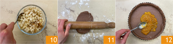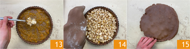 Acrescente os cubinhos de pera 13 e cubra com a segunda camada de massa frolla 14. Feche bem as bordas pressionando com os dedos 15.
