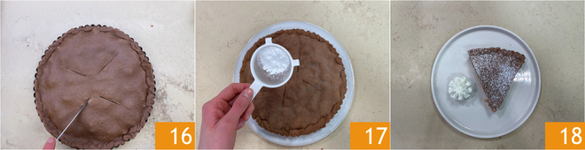 Faça 4 cortes na superfície 16 e asse em forno estático pré-aquecido a 180°C por cerca de 40 minutos, posicionando a forma na prateleira mais baixa. Quando assada, retire do forno e deixe esfriar completamente, depois polvilhe com açúcar de confeiteiro 17. Sua torta vegana está pronta para ser servida com um fio de chantilly vegetal batido, se desejar 18!