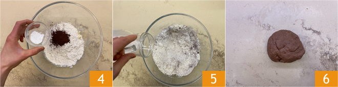 Prossiga com o cacau e o fermento 4, misture rapidamente e despeje a bebida vegetal 5. Sove à mão até obter uma bolinha de massa, envolva em filme plástico e deixe descansar na geladeira por cerca de 1 hora 6.