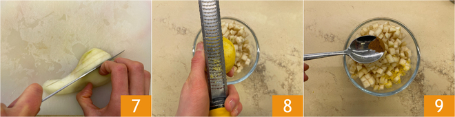 Enquanto isso, descasque e limpe as peras; você deve obter 450 g de polpa, cortada em cubinhos de aproximadamente 1 cm 7. Transfira as peras para uma tigela e aromatize com raspas de limão 8 e canela 9.