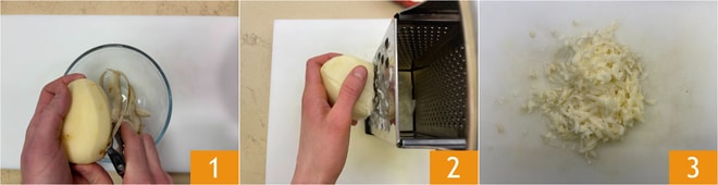 Para preparar os tortéis de batata, comece descascando as batatas brancas 1. Rale-as com um ralador de buracos grandes 2 3.