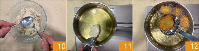 Com a ajuda de outra colher 10, deixe a massa do tortel deslizar no óleo quente 11 e frite até dourar 12. Mergulhe poucos pedaços de cada vez para evitar baixar a temperatura do óleo.