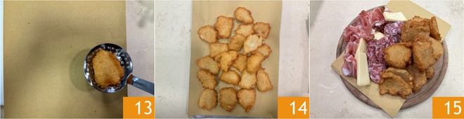 Escorra o tortel em uma bandeja forrada com papel absorvente 13. Proceda dessa forma até terminar a massa; com essas quantidades, você obterá cerca de 30 tortéis 14. Sirva seus tortéis imediatamente, acompanhados por uma tábua de frios e queijos 15!