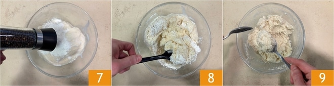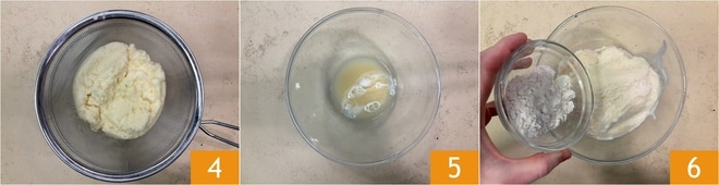 Transfira as batatas raladas para uma peneira 4, para eliminar a água de vegetação 5; a mistura deve ficar seca. Adicione agora a farinha 6.
