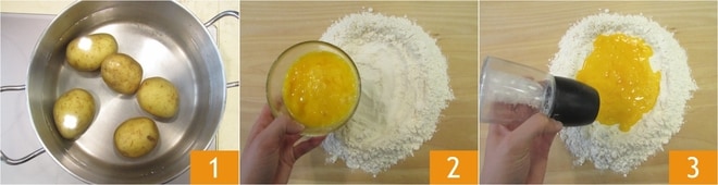 Para fazer os tortellis de batata e linguiça, primeiro cozinhe as batatas por cerca de 30-40 minutos, dependendo do tamanho 1. Enquanto isso, prepare a massa fresca: coloque a farinha sobre uma bancada e forme um monte, depois quebre os ovos no centro 2 e adicione uma pitada de sal 3.