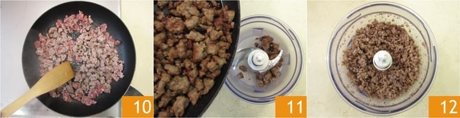 Doure a linguiça por alguns minutos, desfazendo-a enquanto mistura 10. Uma vez cozida, transfira para um processador 11 para reduzir a uma textura mais fina 12.