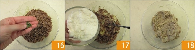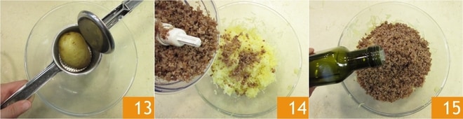 Neste ponto, as batatas estarão cozidas, então amasse-as em uma tigela com um espremedor de batatas 13. Junte a linguiça processada 14 e tempere com azeite de oliva extra virgem 15, sal e pimenta.