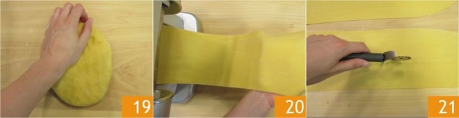 Retome a massa fresca, separe um primeiro pedaço (o restante mantenha no filme plástico), estenda-o com as mãos 19, depois use uma máquina de abrir massa para obter uma folha com espessura de cerca de 1 mm, polvilhando com um pouco de farinha 20. Divida a folha ao meio no comprimento 21.