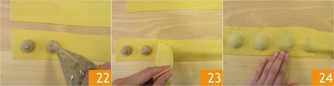 Aperte sobre uma das 2 metades bolinhas de recheio com peso de cerca de 15-20 g cada, espaçando alguns cm 22. Cubra com a segunda tira de massa 23 e pressione delicadamente com os dedos para aderir, cuidando para deixar o ar sair de dentro 24.