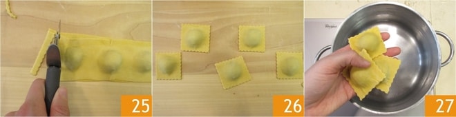 Finalmente, corte as bordas com um cortador de massa ondulado 25 de forma a obter tortellis quadrados de cerca de 5 cm 26. Proceda da mesma forma até terminar a massa fresca. Uma vez prontos todos os tortellis, cozinhe-os em água fervente ligeiramente salgada 27.