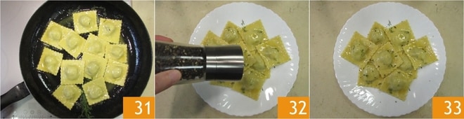 Salteie para misturar os tortellis ao tempero 31. Complete os pratos com folhas de tomilho e uma pitada de pimenta 32. Os tortellis de batata e linguiça estão prontos para serem servidos 33!