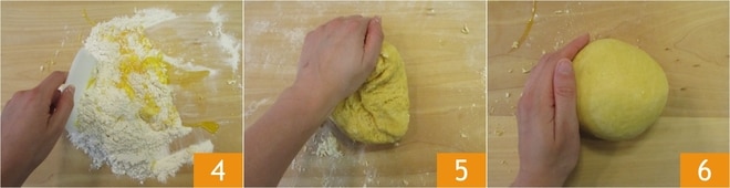 Comece a misturar a massa, recolhendo a farinha aos poucos, ajudando-se também com um raspador 4. Continue amassando à mão sobre a bancada 5, por pelo menos 10 minutos. Você deve obter uma massa lisa e homogênea 6. Envolva a massa em filme plástico e deixe descansar em um local fresco e seco, por pelo menos 30 minutos.