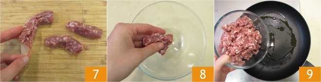 Passe para a preparação do recheio: retire a pele da linguiça 7 e esfarele com as mãos 8. Aqueça um fio de azeite de oliva extra virgem em uma frigideira antiaderente e adicione a linguiça 9.