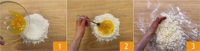 Para preparar os tortelli piacentini, a primeira coisa a fazer é a massa fresca. Coloque a farinha em forma de vulcão e despeje os ovos no centro 1; adicione uma pitada de sal e comece a trabalhar com um garfo 2, depois amasse com as mãos 3.