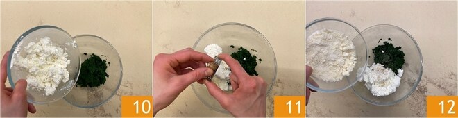 Coloque os espinafres picados em uma tigela, adicione a ricota 10, o sal, a pimenta e a noz-moscada 11. Adicione também o Parmigiano Reggiano DOP ralado 12.