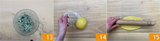 Misture bem até obter uma consistência homogênea 13. Agora pegue a massa que já descansou 14, retire uma parte mantendo o restante coberto. Achate ligeiramente a massa com um rolo 15.