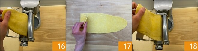 Estenda-a com uma máquina de massa 16; à medida que reduz a espessura, dobre a massa sobre si mesma 17 e estenda novamente 18.