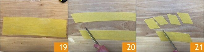 Você deve obter um retângulo muito fino, com espessura de cerca de 1-2 mm 19. Faça 2 tiras de massa dividindo o retângulo ao meio no sentido do comprimento 20, depois corte em losangos de 10 cm 21.