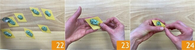 Recheie os losangos com o recheio de espinafre 22 e feche-os. Para fazer isso, leve uma das duas pontas mais longas para dentro 23, depois dobre as duas pontas laterais para o centro 24.