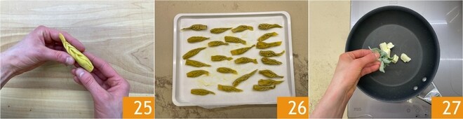 Agora feche o tortelli apertando a massa no centro e movendo-se gradualmente para o exterior 25. O movimento é semelhante ao fechamento dos culurgiones. Continue desta forma até terminar a massa e o recheio 26; você obterá cerca de 40-45 peças. Coloque uma panela cheia de água salgada no fogo. Enquanto isso, em uma frigideira, coloque a manteiga e a sálvia 27. Ligue o fogo e deixe aromatizar.