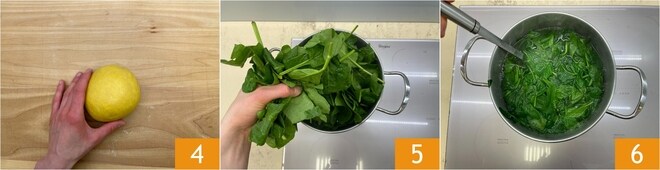 Você deve obter uma massa lisa 4; envolva-a em filme plástico e deixe descansar por meia hora em um local fresco. Enquanto isso, prepare o recheio começando pelos espinafres: mergulhe-os em água fervente com sal 5 e branqueie-os por alguns minutos até que estejam murchos 6.