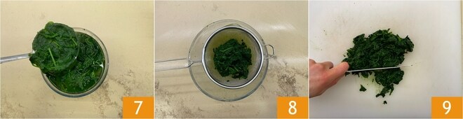 Escorra os espinafres e transfira-os para água fria 7, de preferência com gelo. Depois, esprema-os muito bem 8 e corte-os finamente com uma faca 9.