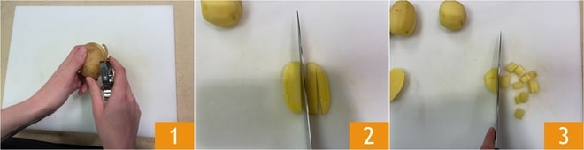 Para preparar a tortilla de patatas, descasque as batatas 1, depois corte-as em palitos 2 e finalmente em cubos de 1 cm 3.