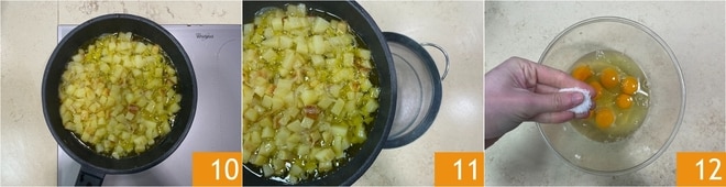 Depois de 10 minutos, a mistura estará quase cozida 10, então retire do fogo e coe o conteúdo da frigideira com uma peneira, reservando o óleo 11. Deixe as batatas e cebolas esfriarem. Enquanto isso, coloque os ovos em uma tigela e tempere com sal 12 e pimenta.
