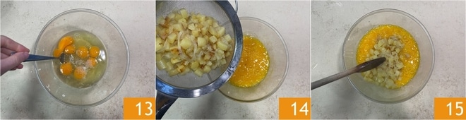 Bata com um garfo 13, depois adicione as batatas e cebolas resfriadas 14. Misture para integrar a mistura 15.