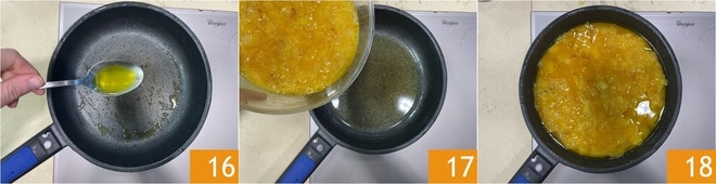 Na mesma frigideira, adicione o óleo reservado 16, depois despeje a mistura de ovos, batatas e cebolas 17 18.