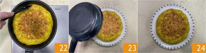 Cubra com uma tampa 19 e cozinhe em fogo baixo por 16 minutos 20. Após esse tempo, as bordas começarão a se soltar da frigideira enquanto o interior ainda estará cremoso: é o momento de virar a tortilla com a ajuda de um prato 21.