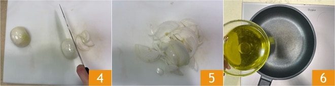 Limpe e corte a cebola primeiro ao meio 4 e depois em fatias finas 5. Aqueça bem uma frigideira antiaderente com diâmetro de 24 cm, depois adicione o óleo abundante 6.