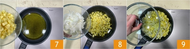 Adicione as batatas 7 e cozinhe por 5 minutos em fogo médio. Após esse tempo, adicione as cebolas 8, cubra com a tampa 9 e cozinhe em fogo baixo por 10 minutos.