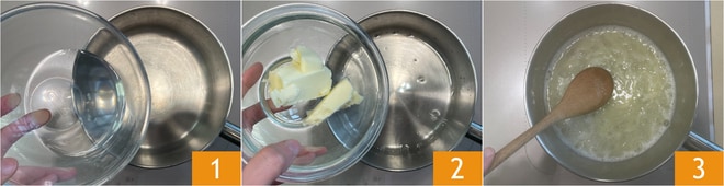 Para preparar as tortinhas de abobrinha, primeiro prepare a massa para a base: em uma panela, coloque a água 1 e a manteiga 2, depois leve à fervura 3.