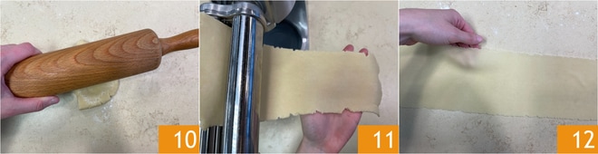Após este tempo, estenda ligeiramente a massa com um rolo 10, depois passe-a entre os rolos da máquina de macarrão, reduzindo gradualmente a espessura 11. Você deve obter uma massa com cerca de 3 mm de espessura 12.